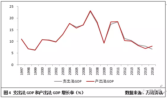 二是在供给侧改革的大背景下,库存周期产生的动因主要来自于供给端,而非需求端。典型的库存周期,实质上是在需求牵引下产生的经济波动,库存变动的原因在于需求变动快于供给变动,从而在供需之间形成差异,造成了库存的不断变动。但是在供给侧改革的大背景下,我国需求并未产生显著复苏,虽然表示总供给的产出法GDP出现了上扬趋势,但表示总需求的支出法GDP增长率却在持续下探(图4),反映了需求整体疲弱,当前的短期经济复苏更多是供给端的改善。但是由于缺乏有效需求支持,供给端的短暂复苏终究不可持续。这也与2017年下半年经济继续进入去库存周期,从而经济增长率将向下修正的预期相一致。