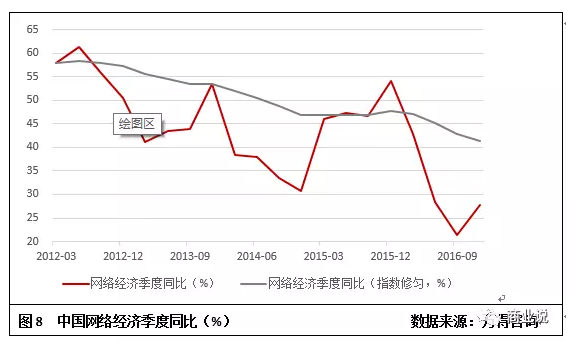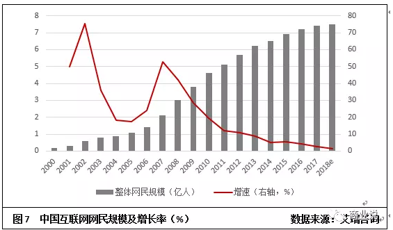 一是以互联网为代表的新经济随着“流量红利”枯竭,正进入发展放缓期。中国互联网网民规模自2007年达到增长率峰值,2012年后PC时代来临之后,增速更是下降到10%以下。据统计2016年,中国网民规模7.2亿人,同比增长4.4.%,预计2017年这一增速将下降至2.8%,2018年增速将进一步下降至1.4%。中国已经脱离网络流量的增量时期,进入在当前网民存量中挖掘金矿的时期。(图7)