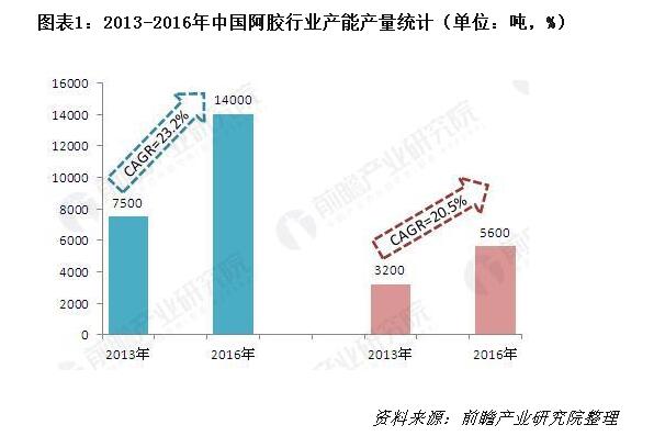 阿胶行业市场需求与投资规划分析报告》数据显示,从产量数据来看,总体上目前我国阿胶行业的产能利用率较低,2016年我国阿胶行业的产量约为5600吨。以行业龙头企业东阿阿胶的数据为例,目前该公司的阿胶块产能为4000吨,但其实际产量仅1600吨,产能利用率仅40%。