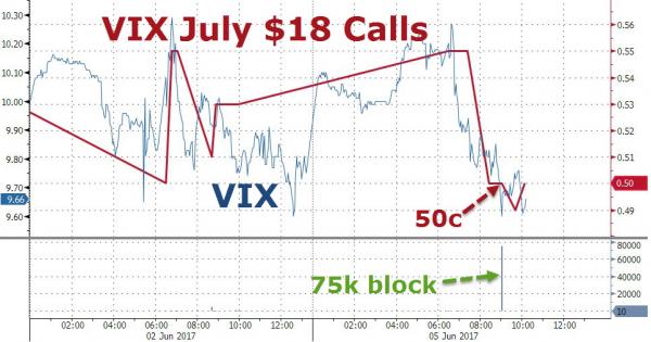 As Bloomberg reports, the volatility buyer or buyers dubbed “50 Cent” appears to have returned to the market again on Monday, following Friday’s trades as the VIX continues to trade below 10.