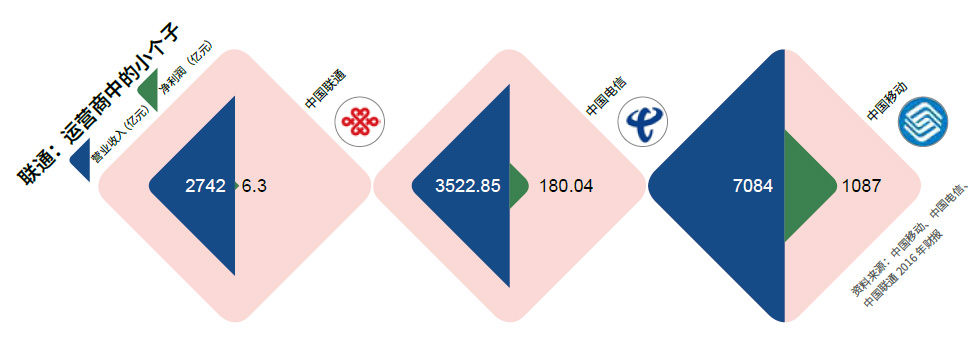 中国联通于2009年初在原中国网通和原中国联通的基础上合并组建而成,业绩和规模一直落后于中国移动和中国电信。以2017年上半年数据看,中国联通实现服务收入1241.1亿元,净利润24.2亿元;而中国移动实现营收3889亿元,净利润达627亿元;中国电信同期营收1841.2亿元,净利润125.4亿元。从净利润规模的角度看,联通不到中国移动的4%,不到中国电信的20%。