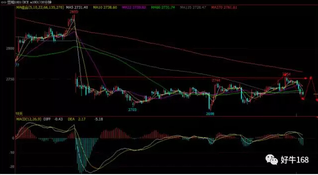 从三十分钟级别来看,豆粕价格依旧在底部盘整,但是价格有尝试触及270日均线,后期关注价格是否会将其击穿而形成多头排列。而日线级别价格反抽至22日与66日均线的时候遇到了较强的压力,价格进一步给到回调,所以建议日内建议以震荡格局去做单,日内建议2760布局空单,止损2770,止盈2720;2720布局多单,止损2700,止盈2760。