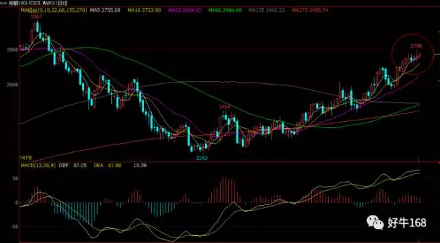 从日线图来看,甲醇均线系统已经呈现多头排列,价格整体在5日与10日均线之内运行,而66日均线在试探135日均线,所以短期内价格可能会等待均线跟上,但是多头力量足以强,所以日内最好以低多为主。日内建议:2710附近布局多单,止损2690,止盈2780附近;2780附近布局空单,止损2800,止盈2740附近。