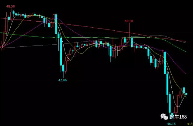 从小时图来看,昨日油价大幅下行,尾盘稍有反弹。目前均线呈空头发散走势,5均线有所拐头,但走势依旧较弱,预计反弹调整触及22均线或将再度下行。建议上探47.10附近做空,止损47.30附近,止盈于46.30附近。同时价格下探46附近做多,止损于45.85附近,止盈于46.6附近。目前油价较弱,多单谨慎操作,尽量高空为主。