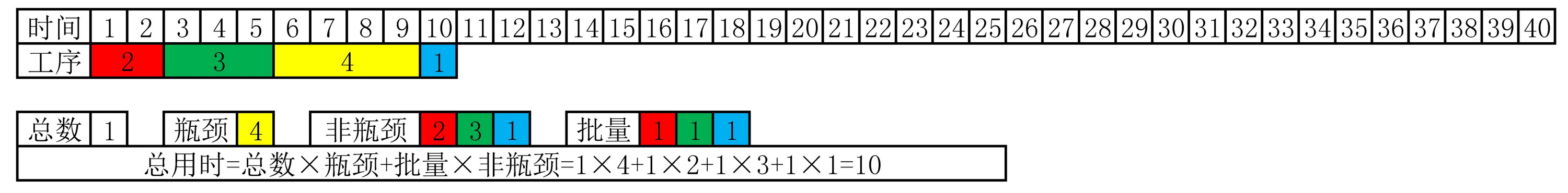 =批量×单件总用时+总数×瓶颈工序用时-批量×瓶颈工序用时