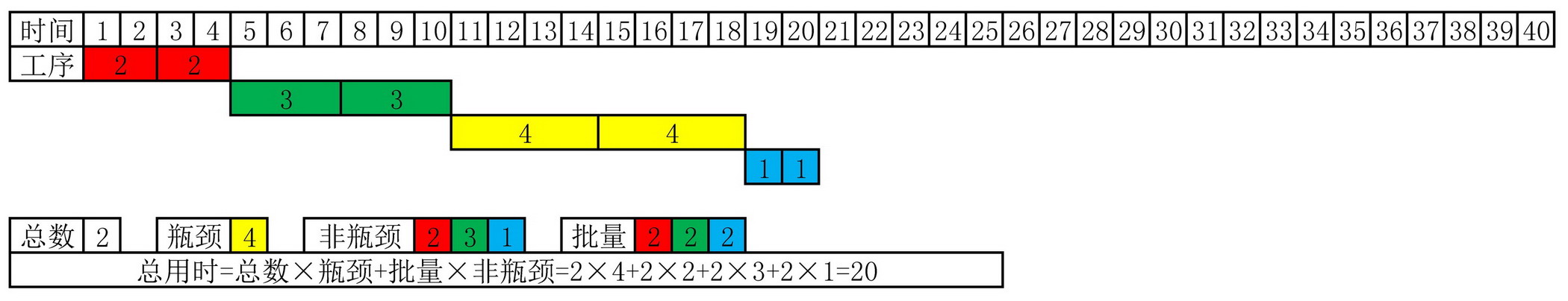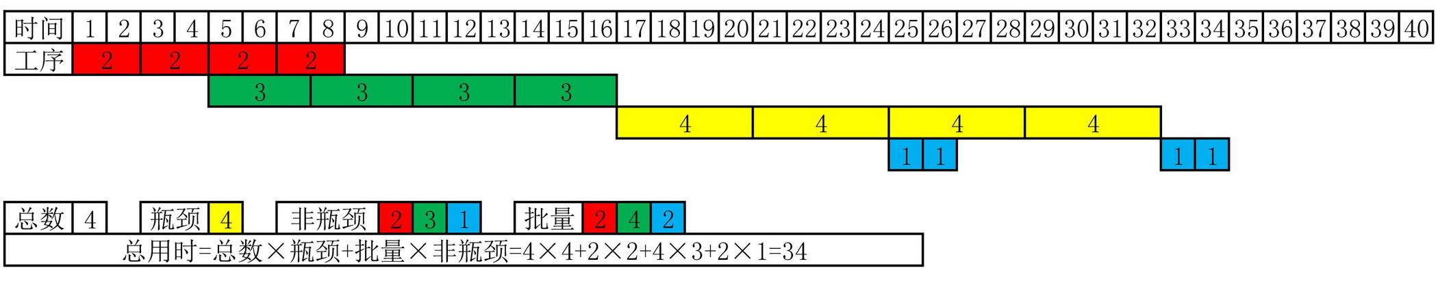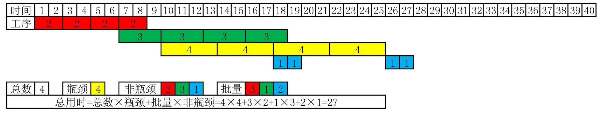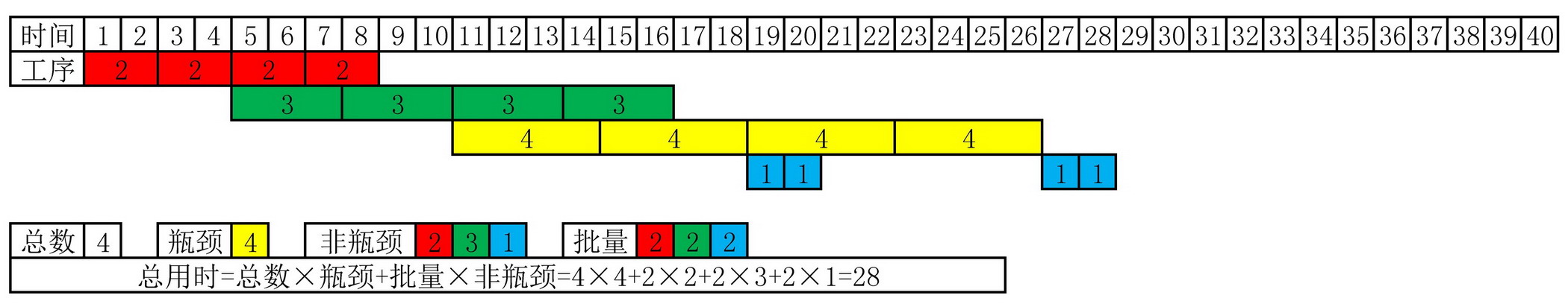 工序总用时=批量×[单件总用时+瓶颈工序用时×(总批次数-1)]