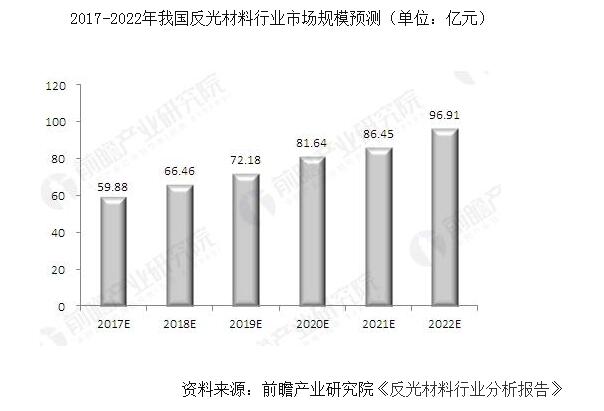 反光材料行业市场前瞻与投资战略规划分析报告》数据预计,2017-2022年间,我国反光材料行业年复合增长率将在10%左右,到2022年,市场规模将逼近百亿元,达到96.91亿元。