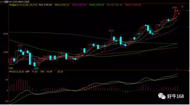 从日线图来看,甲醇均线系统已经呈现多头排列,价格依托五日均线进一步上行,但是价格与均线的乖离较大,短期价格面临部分的调整之后再进一步上行,所以日内当价格给到部分的回撤之后即可布局多单。日内建议:2800附近布局多单,止损2780,止盈2860附近;2860附近布局空单,止损2880,止盈2800附近。
