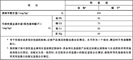 2009年,国家颁布了GB 24410-2009《室内装饰装修材料水性木器涂料中有害物质限量》的国家标准,该标准对水性木器涂料和水性腻子中对人体和环境有害的物质进行了限制,主要包括挥发性有机物、苯系物、乙二醇醚及其酯类、游离甲醛、可溶性重金属含量,如下图。