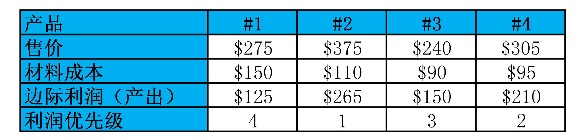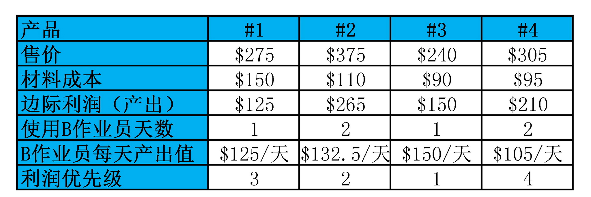 从瓶颈的角度衡量,产品#3最赚钱生产9个(用掉9天B作业员的时间),产品#1跟#4是较不赚钱,各生产4个满足需求就好(#1用掉4天,#4用掉8天B作业员的时间),还剩15天B机器时间可生产7个产品#2还剩1天,此一天可多生产一个产品#1。