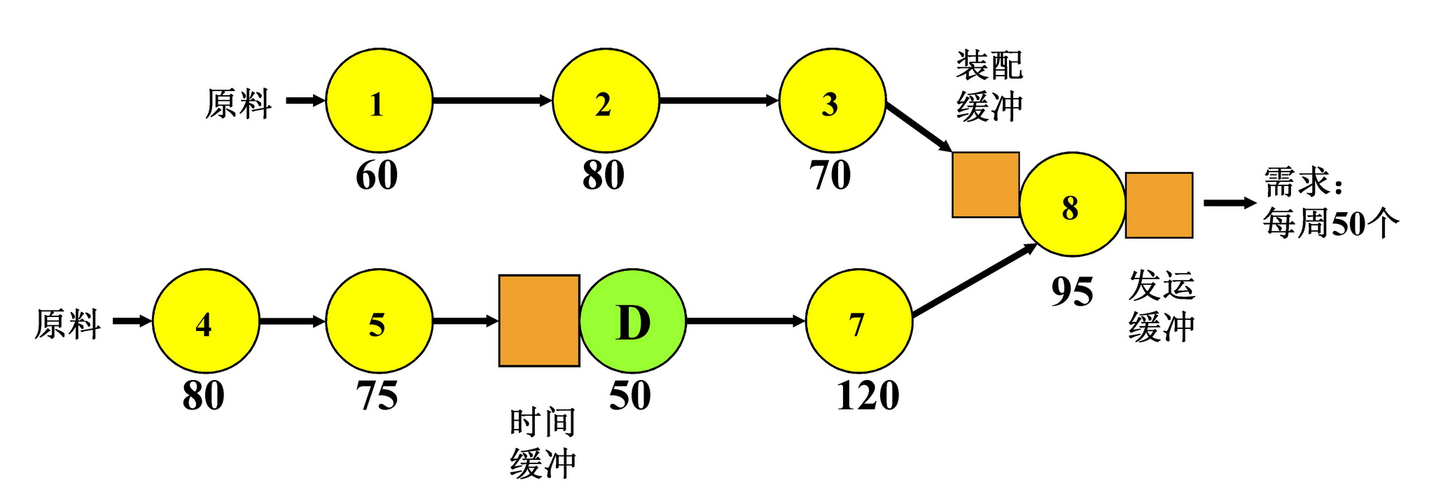 上边的例子上成品需要经过8个环节才能实现,每一各环节下边的数字是此道工序每周可以生产的个数。所以工序D是瓶颈。在TOC中由瓶颈的节奏(鼓)来决定生产计划,由绳子控制发料,由时间缓冲来防止墨菲效应(系统扰动),保证有效产出。