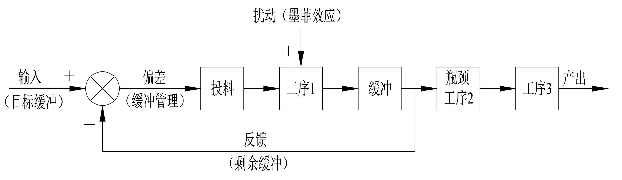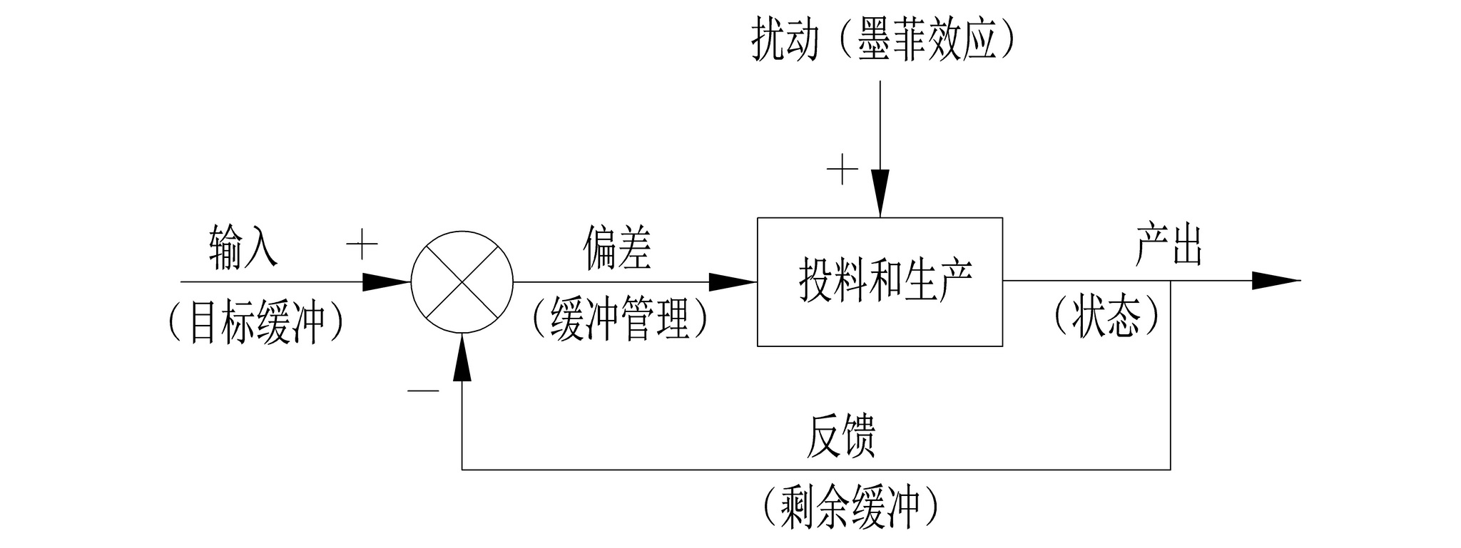 TOC制约理论的简单系统框图如下图所示,包括系统的输入(目标缓冲),投料和生产,产出,剩余缓冲反馈(剩余缓冲),偏差(缓冲管理)和扰动(墨菲效应)(如图6-97所示)。