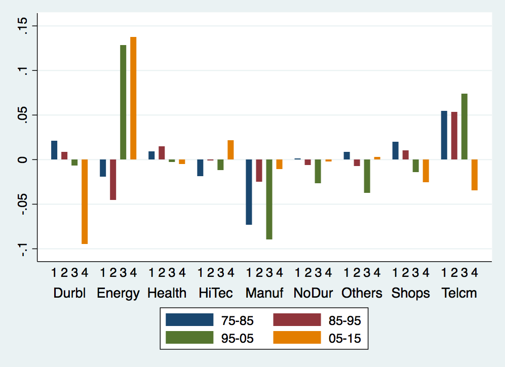 graph bar change10share21-change10share24, over(period1) over(xax) stack legend(lab(1 "75-85") lab(2 "85-95") lab(3 "95-05") lab(4 "05-15"))