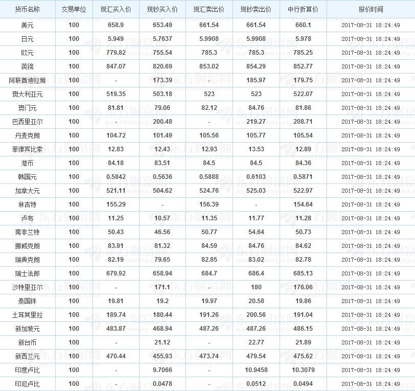 中国银行外汇牌价 2017-08-31(图片来源:东方财富网)