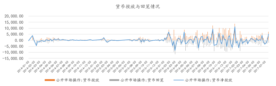 市场流动性,很关键的一点是看央行是在向市场投放钱,还是回笼钱(回购与逆回购操作)——回购为中国人民银行向一级交易商卖出有价证券,并约定在未来特定日期买回;逆回购为中国人民银行向一级交易商购买有价证券,并约定在未来特定日期将有价证券卖出。二者的差值就是货币的净投放量,再通过存款、贷款活动,货币的实际投放量会成倍数增长,这就是市场上“钱荒”、“钱多”产生的来源