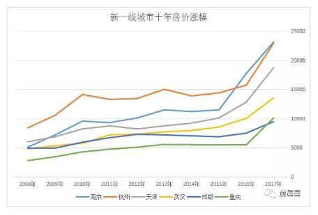 从涨幅上看,南京十年涨幅高达353%,重庆为266%,天津为211%,而杭州、武汉、成都均不到200%。