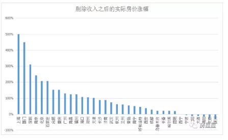 通过简单剔除收入涨幅,可以得到各城市十年房价实际涨幅: