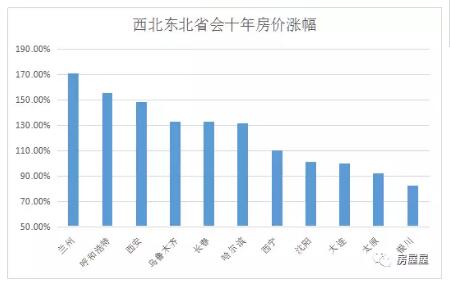 房价涨幅垫底的城市里,东北三大省会(沈阳、哈尔滨、长春)全部在列,而西北城市(西安、兰州、乌鲁木齐、西宁、银川)也几乎无一遗漏。