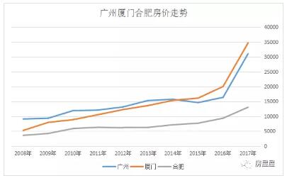 2008年,厦门房价只有5000多元,而到了2017年,一跃达到3.4万元。无论是房价绝对值,还是涨幅,都超过了作为一线城市的广州。