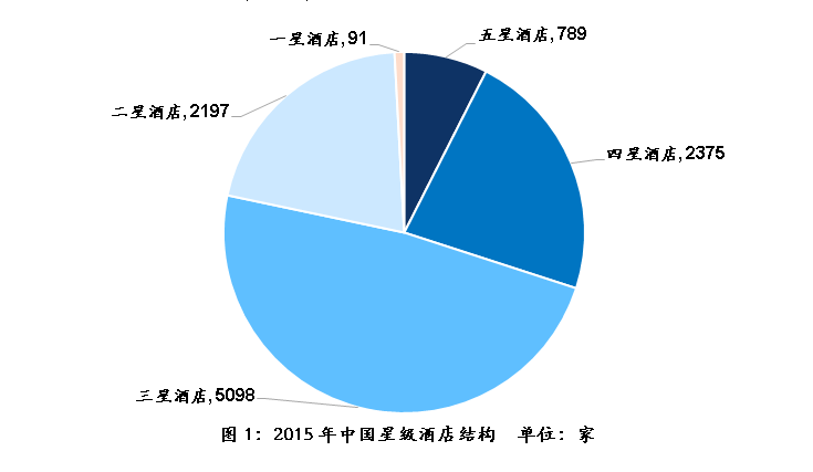 根据国家统计局数据,中国2015年住宿业营业额为3648.22亿元;共计有法人类企业18937家,从业人数1911615人,客房数量337.2万间。 其中星级酒店共10550家,营业额为2106.75亿元; 星级酒店结构分布如图: