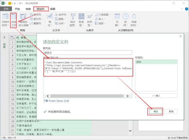 Json.Document(Web.Contents("http://api.bosonnlp.com/sentiment/analysis",[Headers=[#"X-Token"="UGlLtDcd.16189.rHC5FhNFHzqU"],Content=Text.ToBinary("["""&[评价]&"""]")]))