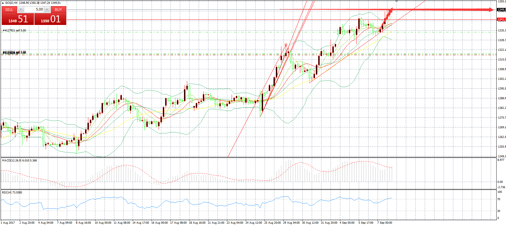 国际现货黄金周四(9月8日)强势上涨,美市盘中最高上探至1348.91美元/盎司,继续刷新一年高位,金价再度逼近1350关口。美元在美国就业数据不佳之后走弱,美元指数回落至91.405,是2015年1月以来的最低点。日内公布的美国上周申请失业救济金的人数暴增至29.8万,增加6.2万人,增幅达26%,创2015年2月以来新高,远超预期24.5万人。在飓风蹂躏的德克萨斯州的申请激增。周四欧洲央行宣布维持主要再融资利率于0%水平不变,没有公布有关退出宽松货币政策的计划;欧洲央行大幅上调2017年欧元区GDP增速预期,但同时下调2018年与2019年的欧元区通胀预期。
