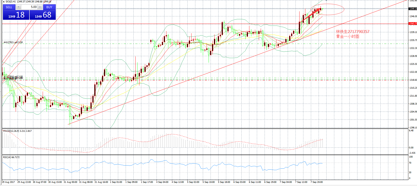黄金现在小幅度上涨,突破新高,现已到达关键阻力1350,成功突破,多单大胆进入