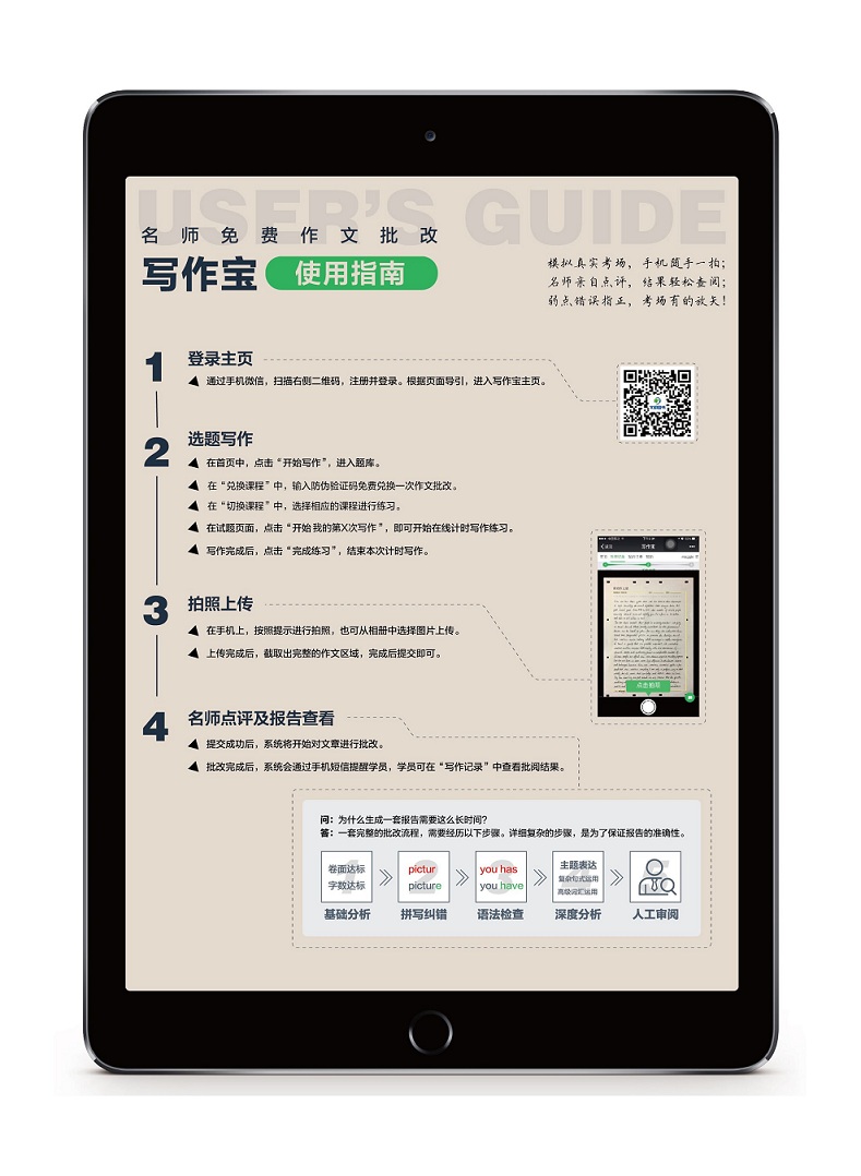 针对大家这一要求,文都教育教师团队与写作宝英语测评+人工智能团队联合推出考研英语作文批改服务-写作宝,协助考生更好的复习备考。我们的这项服务是由文都考研名师在后台批改评判的,并且这项服务,还可以给大家提供大量的练习题,包括有近十年的历年真题,和大量模拟题目,当然,大家自己做题,直接提交批改也可以。