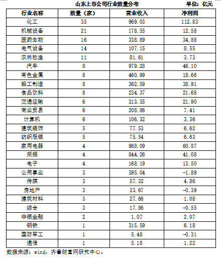 近几年,山东上市公司得到了快速发展,但上市公司行业分布仍不合理。齐鲁财富网研究中心根据wind公布中报数据对山东上市公司基本情况进行简单梳理发现,截至9月8日,山东189家上市公司中,化工行业上市公司数量最多高达35家,汽车行业在2017年实现营业收入979.28亿元稳居山东26个行业的首位。