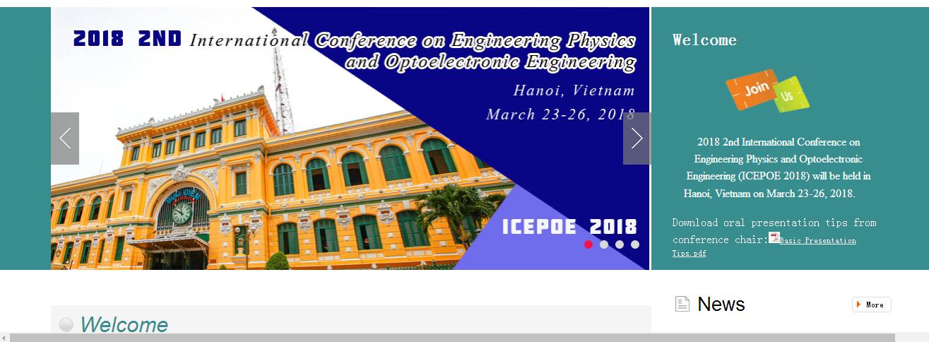 ★第二届ICEPOE2018将围绕“工程物理与光电工程”的最新研究领域而展开,为研究人员,工程师和学者,以及行业专业人士提供一个平台并介绍他们的最新的研究成果以及今后开发的活动,为参会人员们交流新的思想和应用经验建立业务或研究关系。本次会议将于2018年3月23-26日在越南河内召开,在会议期间您将有机会聆听到前沿的学术报告,见证该领域的成果与进步。