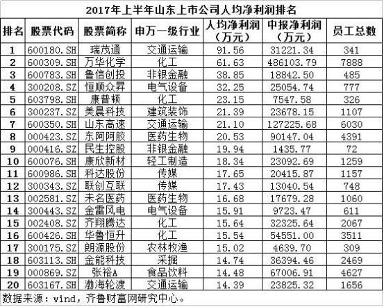 根据wind资讯的统计,山东上半年实现净利润(注:本文指归属母公司股东的净利润)最多的上市公司前三名分别是万华化学(600309)、青岛海尔(600690)和兖州煤业(600188)。但若按人均净利润的指标来排名,万华化学(600309)排名第二,青岛海尔(600690)和兖州煤业(600188)在山东189家(含2家B股公司)上市公司中跌出前20名,仅排名第56位和第77位。