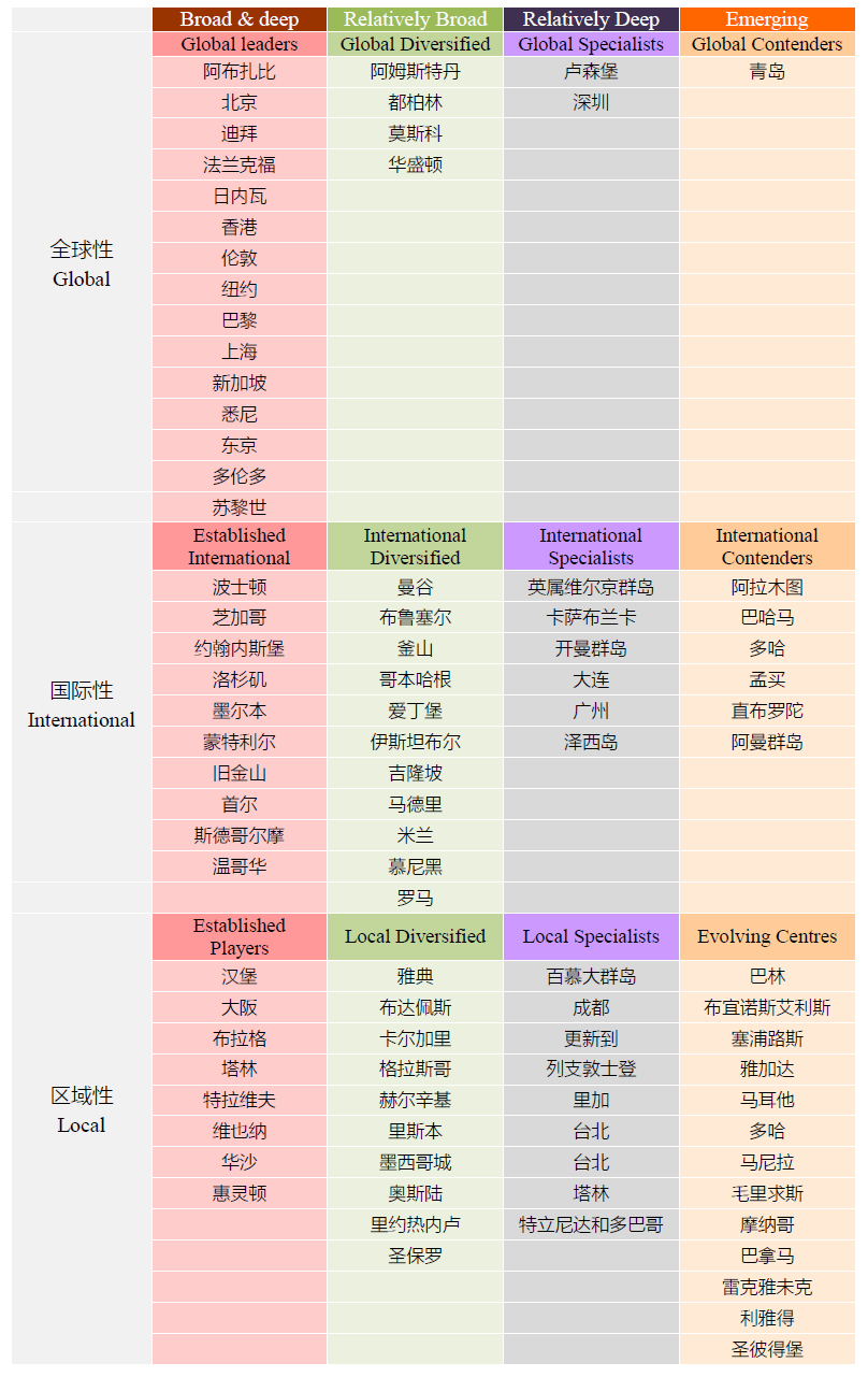 有15个“全球性顶尖”金融中心(Global Leaders)(表格左上栏)开展广泛而专业的金融服务,同时与世界其他金融中心有着密切的联系。这些金融中心中包括五大全球领先的金融中心,其他的顶级金融中心可以被归类为成熟性国际金融中心(Established International Centre)。
