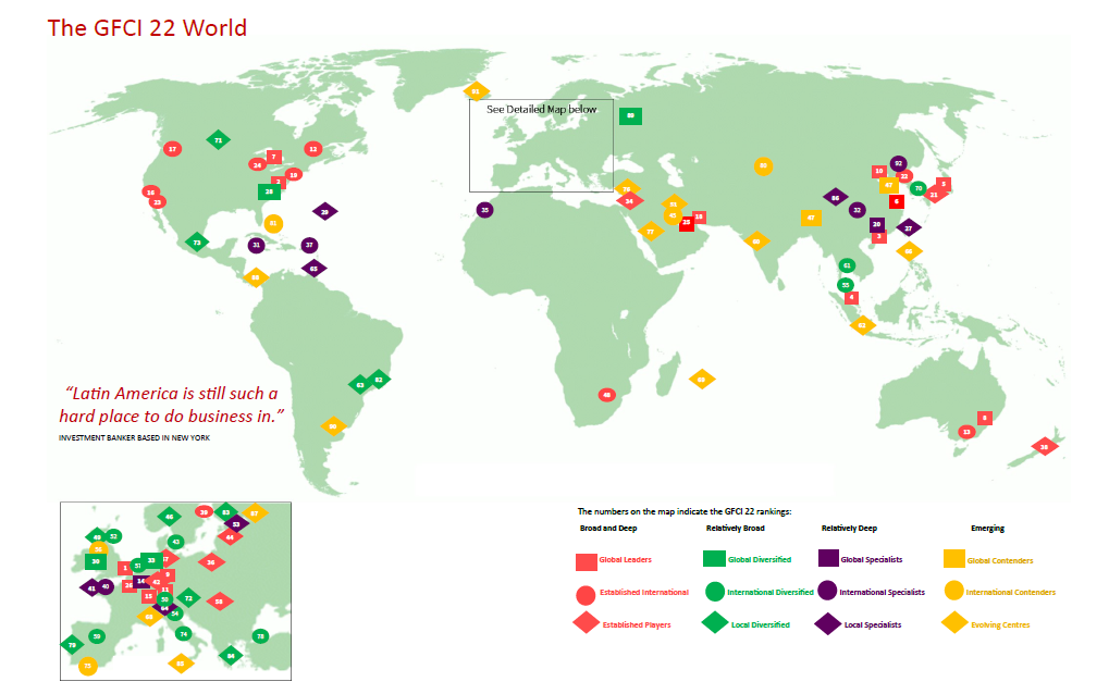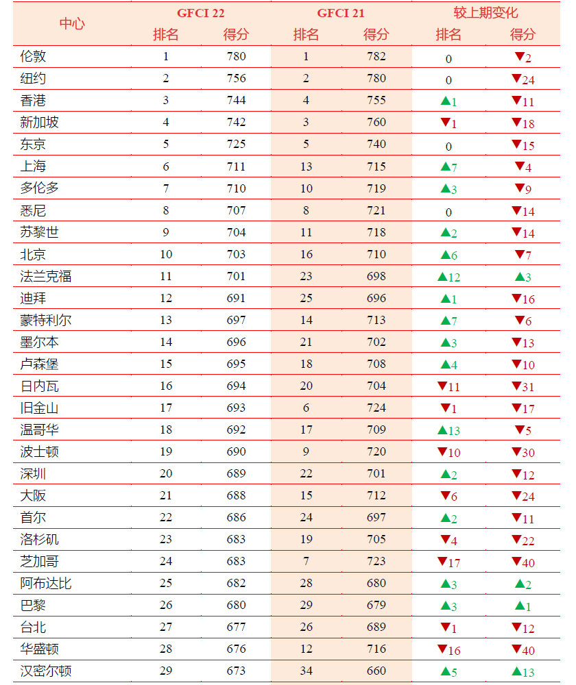 GFCI 22的重大变化包括:阿布扎比,上海和悉尼成为全球性顶尖金融中心,莫斯科成为多元化国际金融中心(以前是一般国际金融中心),以及特拉维夫成为成熟性区域金融中心(以前是新兴区域金融中心)。