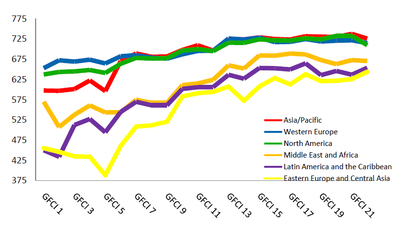 图2显示了每个区域排名前5的金融中心得分平均值,我们可以看到,随着时间的推移,西欧和北美地区的顶级金融中心已经逐渐丧失其历史统治地位。亚太地区排名前5的金融中心的平均得分业已超过西欧和北美地区顶级金融中心相应的数值。其他地区的顶级金融中心,尤其是拉美地区和东欧/中亚地区的金融中心也在缩小与之差距。