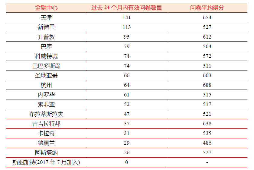 表2所列的“候补金融中心”参与了GFCI 的问卷调查,但是没有达到足够的有效问卷数量,故未列入正式排名。