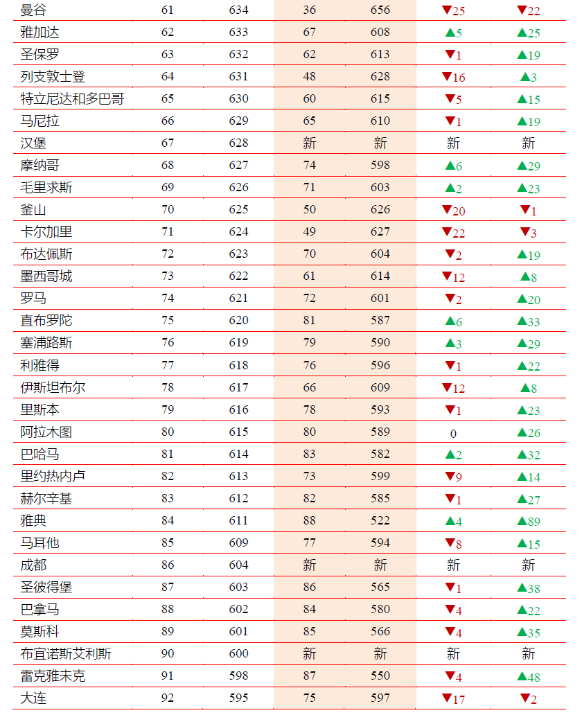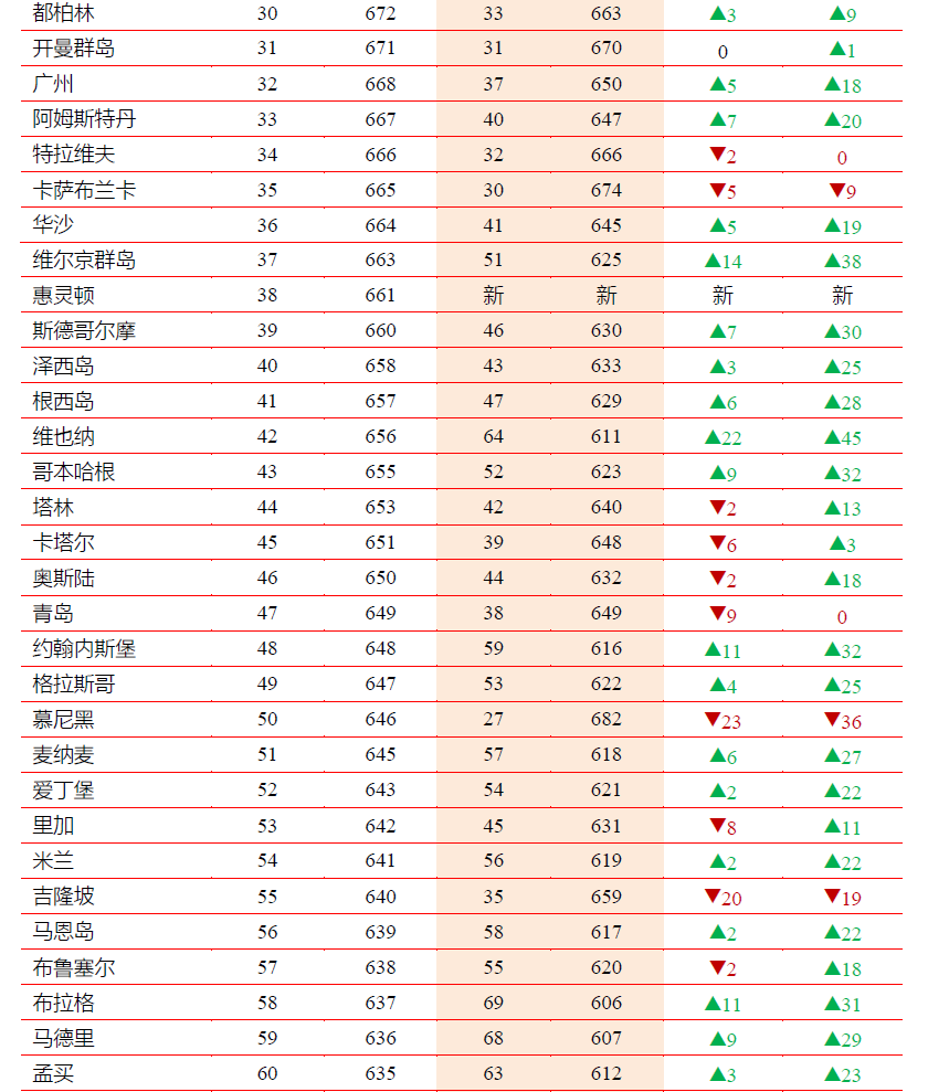 人们对顶级金融中心的信心整体下降。排名前25的金融中心有23个评分下降,仅有2个评分上升。排名最后的25个金融中心却有20个评分上升。