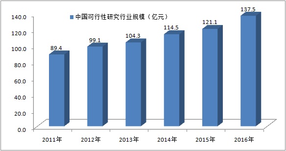 可行性研究必须从系统总体出发,对技术、经济、财务、商业以至环境保护、法律等多个方面进行分析和论证,以确定建设项目是否可行,为正确进行投资决策提供科学依据。项目的可行性研究是对多因素、多目标系统进行的不断的分析研究、评价和决策的过程。它需要有各方面知识的专业人才通力合作才能完成。可行性研究不仅应用于建设项目,还可应用于科学技术和工业发展的各个阶段和各个方面。根据中为智研观察,工业发展规划、新技术的开发、产品更新换代、企业技术改造等工作的前期,都可应用可行性研究,2016年我国可行性研究市场规模为137.5亿元。中国可行性研究咨询机构经营规模情况
