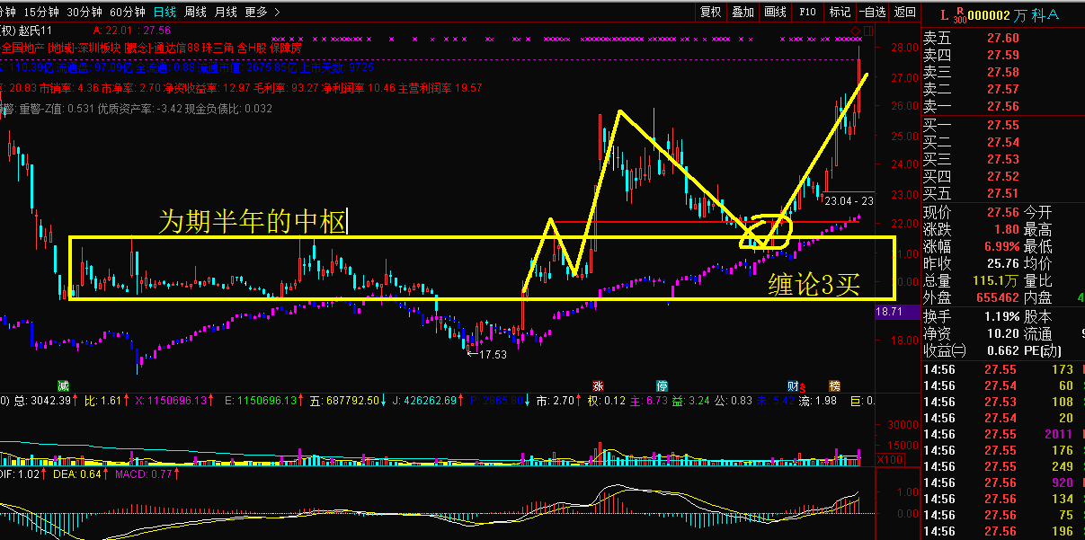 万科从2016年12月份至2017年6月份,是一个为期半年的中枢,6月23日涨停板放量突破,8月18日一根放量大阳线确认回踩完成,缠论3买成立,从6月26日-8月18日,期间经历近2个月,39个交易日的调整,然后就是一路开挂上涨,目前涨幅大概30%。今天已经突破6月份高点,目前还没有出现买点,有的话可以持有,但是不建议现在追。