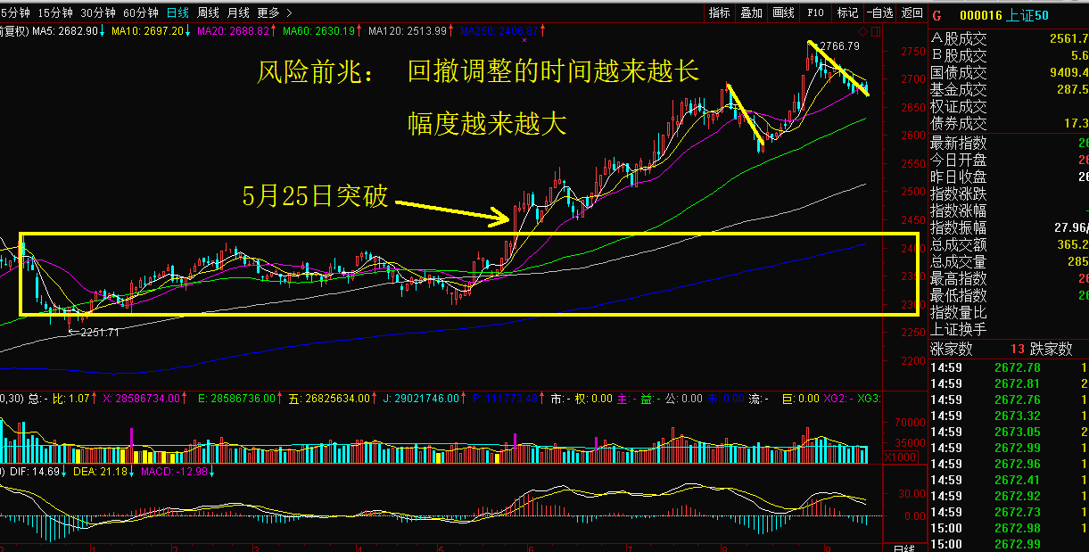 上证50自5月25日突破以来,涨了快4个月,最近的两次调整(8月2日和8月28日的调整),调整的时间越来越长,调整的幅度越来越大,说明风险在加剧。