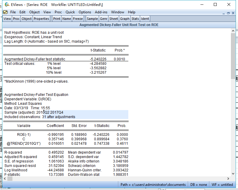 (1)若拒绝原假设,则可以根据单位根检验回归结果中截距项的显著性进行判断截距项是否显著。若显著不为零,则认为该序列为含截距项平稳序列,否则,为不含截距项平稳序列。