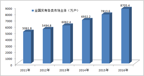 近年来我国宏观经济持续快速增长,国家经济总量不断增加,我国企业数量不断增加。经济形势和企业数量的快速增长使得我国企业的咨询研究服务需求也将随之扩大,这为我国研究咨询服务行业的稳步发展奠定了较好基础。2015年我国工商登记注册企业数量规模为7813.6万家。至2016年底,全国实有各类市场主体8705.4万户,其中,企业2596.1万户,个体工商户5930万户,农民专业合作社179.4万户。