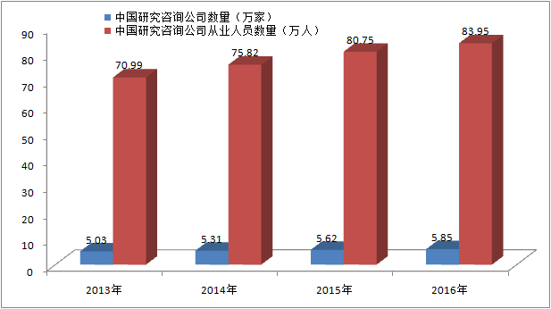 2013-2016年我国研究咨询行业企业及人员数量情况