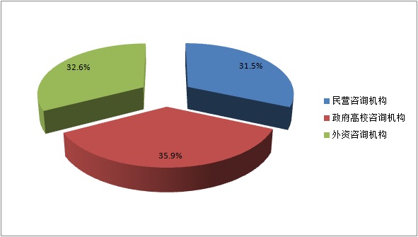 根据中为智研观察目前我国咨询服务市场呈现三足订立的趋势,外资咨询机构在战略咨询及管理咨询领域具有较高占有率,占比高达32.6%;民营咨询机构在市场咨询及信息咨询具有较强优势,占比31.5%;而政府高效咨询机构在社会政府领域咨询具有更强的竞争优势。