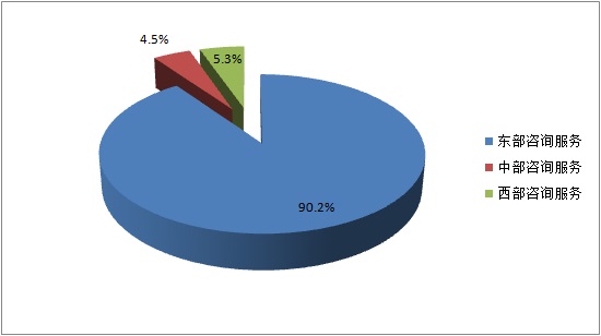 国内咨询行业地理分布呈现出东强西弱、南强北弱特点。东部地区咨询服务占全国咨询服务的90.2%,中部地区占比4.5%,西部地区咨询服务占比5.3%。这体现出智力集中化,这也与东部经济发达的情况吻合。