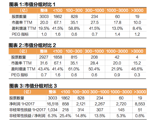 计算结果显示,截至2017年8月31日,基于2017年的上市公司半年报盈利,整体组合的市盈率TTM为20,盈利增速TTM19.5%。从分市值组合的市盈率看,低于100亿市值的组合市盈率为67.1,显著大于整体水平;从分市值组合的盈利增速看,低于1000亿市值组合的盈利增长超过40%,显著大于1000亿以上市值组合。(见图表1)