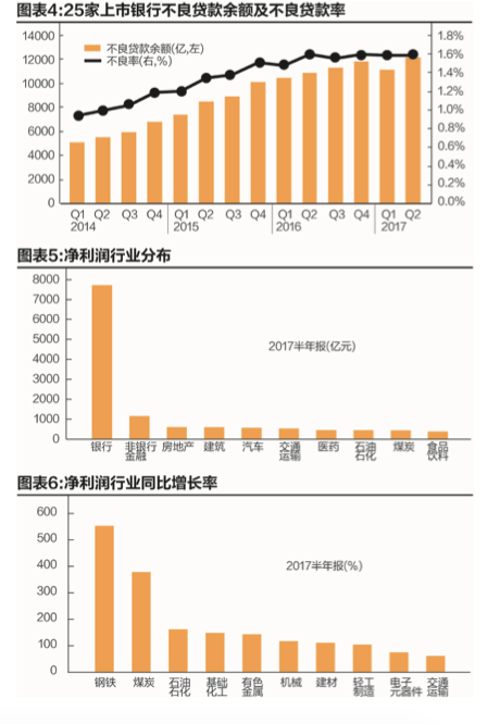 选取25家银行上市公司进行分析,截至2017年8月31日,市盈率TTM为7.4,显著低于全体水平20;其盈利增速TTM为3%。而对2017年半年报统计显示,25家上市银行盈利季度同比增长4.9%,有边际改善的趋势。与此相对应的是,银行业的不良率和不良贷款余额居于高位,根据半年报数据,25家上市银行的平均不良率已达1.586%;不良贷款余额达12196余亿元。(见图表4)