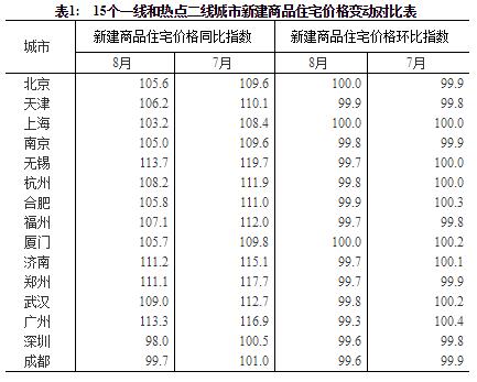 8月份,在因地制宜、因城施策的房地产调控政策持续作用下,15个一线和热点二线城市房地产市场延续稳定态势。从环比看,新建商品住宅价格下降或持平;从同比看,新建商品住宅价格涨幅均继续比上月回落,回落幅度在1.3至6.6个百分点之间。