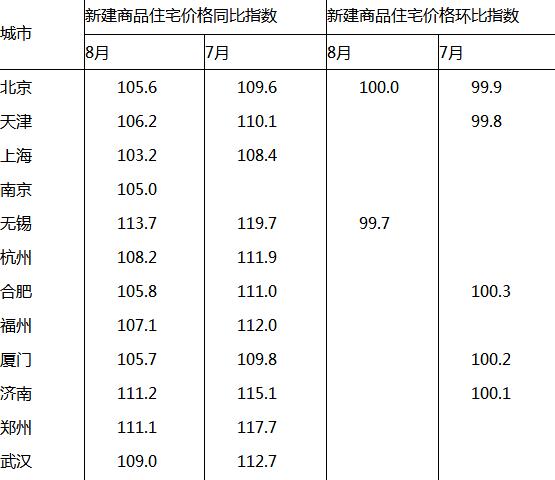 8月份,在因地制宜、因城施策的房地产调控政策持续作用下,15个一线和热点二线城市房地产市场延续稳定态势。从环比看,新建商品住宅价格下降或持平;从同比看,新建商品住宅价格涨幅均继续比上月回落,回落幅度在1.3至6.6个百分点之间。