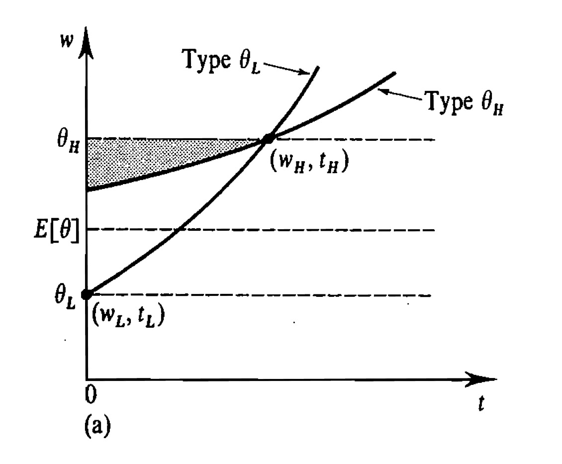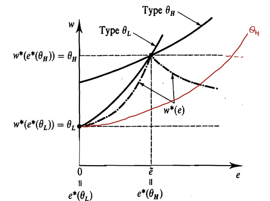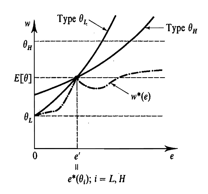 类似于企业用不同合同筛选的情况,也可能存在分离均衡,即不同类型的劳动者取得不同程度的学历,最后获得不同档次的工资。如下。(thetal,0)代表低效率者选择的(工资,学历)组合,(thetah,e>0)(好吧e没有标出来)代表高效率者的选择。(这种均衡下公司利润为0。)