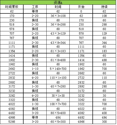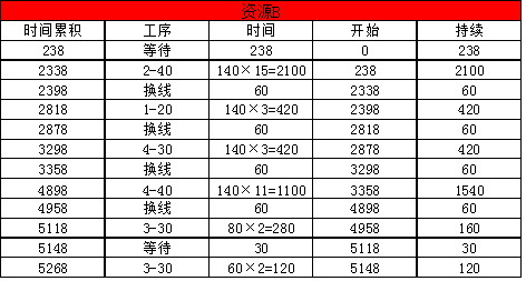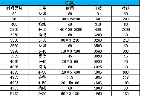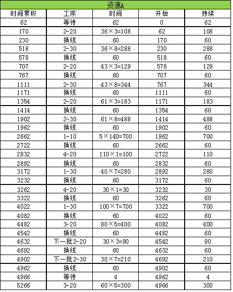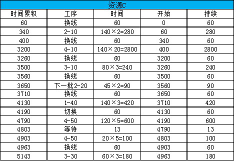 在下一批生产中,资源C需要换线6次,140个成品需加工的时间为140×33-90=4530分钟,总时间是4530+60×6=4890分钟。上一批次中资源C比资源B先结束,节省5268-5143=125分,这批次资源C比资源B少5090-4890=200分钟,200+125=325分钟大于需要为下一批2#零件2-10生产45个花费的时间45×2+60=150,所以资源C在这一批还可以为下一批做准备。